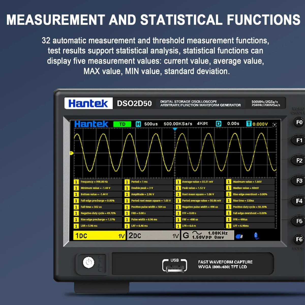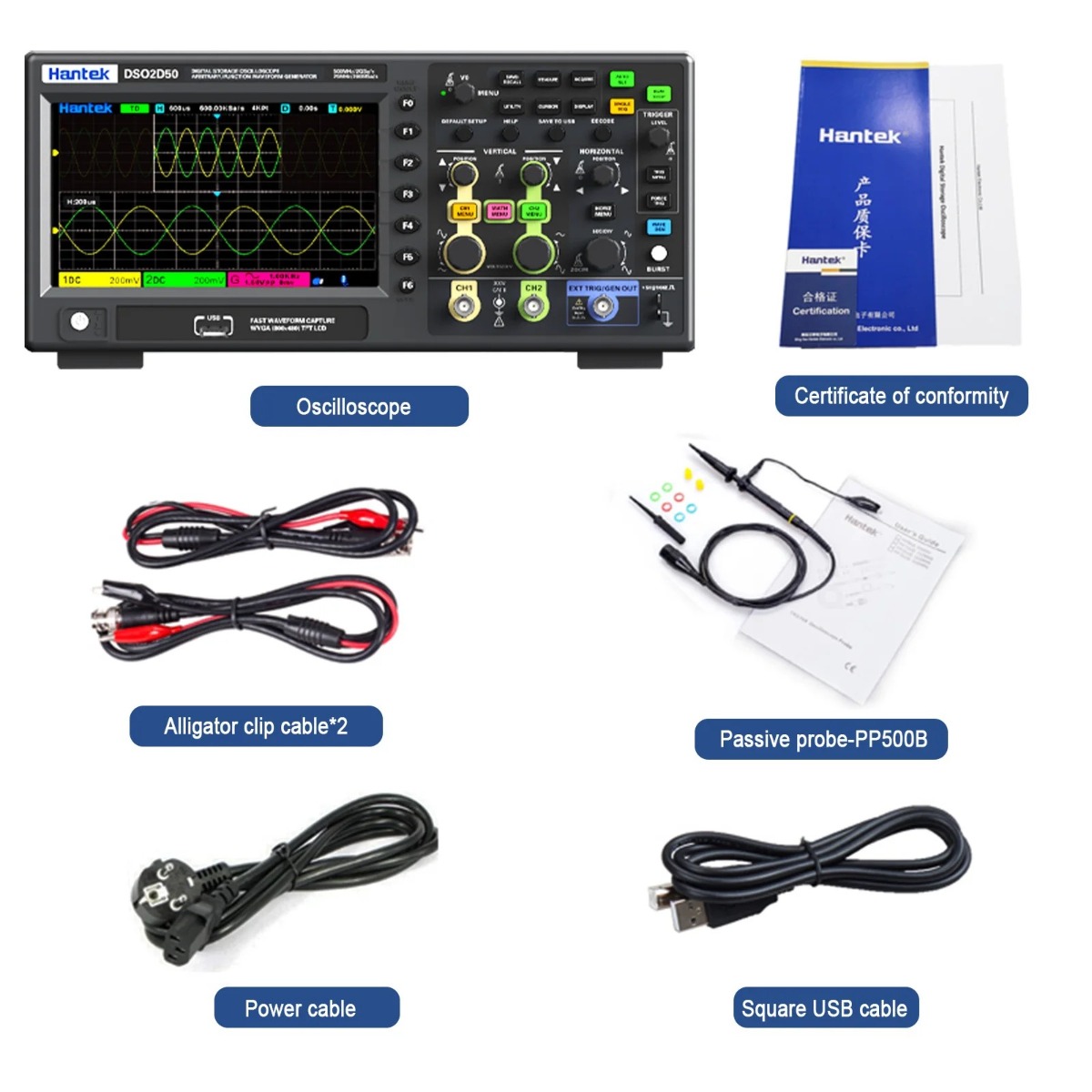 Hantek DSO2D50 ออสซิลโลสโคปดิจิทัล 2CH 500MHz 2GSa/s พร้อมฟังก์ชันเจนเนอเรเตอร์ 25MHz